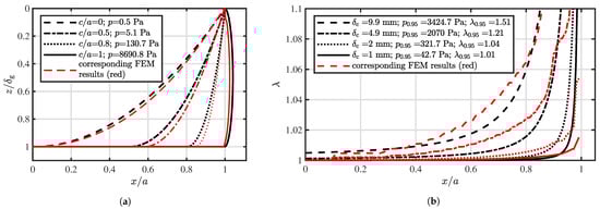 In Figure 4a membrane profiles for an initial deflection and various values of were calculated and plotted using Equations (1) and (2). To increase contact length c, the membrane pressure p also had to be constantly increased up to a maximum pressure value . Assuming the full contact surface , a compressive force would result, which needed to be absorbed by the working surface below. The FEM results basically coincided well with the analytic approach, although the calculated displacement and the resulting membrane shapes slightly differed. A different number of finite elements and the differing stress state (1D and 3D) regarding both approaches might explain these discrepancies.