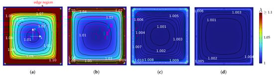 In Figure 5 the equivalent stretch in the x- and y-directions of the free membrane’s surface after a 95% no-slip contact is illustrated for different values of . Iso-contour lines mark equivalent stretch regions. Due to the rigid boundary condition, no deformation occurred at the wide membrane edges. The plots illustrate non-homogeneous stretch distributions, which started with circular iso-contours in the center and segued into rectangular ones at the edges. In the corners pre-stretch slightly rose compared to values along the x- or y-axes. As already assumed, the total pre-stretch decreased significantly by decreasing ( Figure 5a) down to ( Figure 5d). Moreover, Figure 5c illustrates that almost the entire surface stretch was below 1%. Close to the clamp edges a sharp increase could be observed, which was explained by the bending stretch of the 5% inflated free standing membrane part. However, after sheet lamination with , pre-stretch below 1% could be expected for more than 90% of the dielectric surface area (excluding the fixated edges).