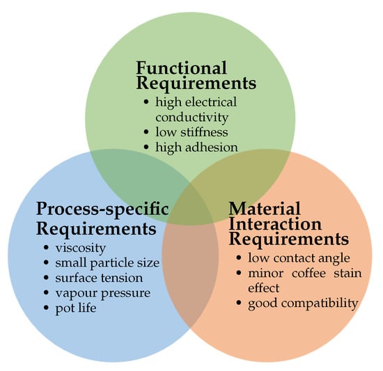 Major requirements for the electrode application process derived in three categories: functional requirements of the electrode layer, process-specific requirements of electrode ink, and requirements for the interaction between the elastomer film and printed ink drops [25].