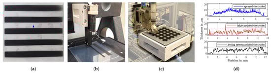 Comparing three methods for electrode application. (a) Eight electrode layers (80 mm × 8 mm) sprayed with spray nozzle Multispray Mod. 940 through the shadow mask. Arrow marks the position of profile measurement. (b) Printing test with the inkjet printer AD-K-801 [31]. (c) Printing test rig with the jetting system MDS 3280. (d) Thickness profiles of three electrode layers applied via spraying nozzle (top), inkjet printer (center) [31] and jetting system (bottom) [35]. The sprayed electrode layer had heavy fluctuation on the surface profile because of the low spray resolution. The inkjet printed electrode layer was more homogeneous but had high roughness because of the coffee stain effect. The electrode layer printed via the jetting system had higher homogeneity and lower roughness compared with the inkjet printed layer.