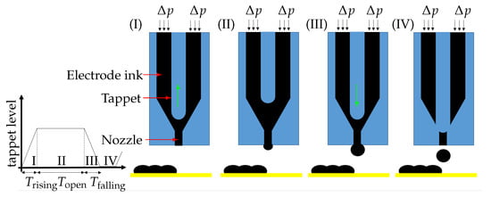 The working principle and construction are briefly introduced according to Figure 8. The ink cartridge is connected to the conical chamber, where a tappet is positioned on the nozzle orifice. A piezo actuator drives the tappet via a lever and, thus, the nozzle is closed and opened. The ink in the cartridge, under air pressure p, fills the conical chamber to which the nozzle is mounted. By the reciprocating movement of the tappet, the ink is jetted out through the nozzle orifice. The tappet motion is controlled by adjusting the time intervals with the controller: , , , and the tappet level h. In addition, the cartridge pressure is adjustable up to 8 bar.