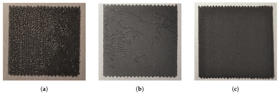 Pictures of printed layers (20 mm × 20 mm) applied with the Jetting System MDS 3280 on the 20 thin elastomer film Elastosil(R) 2030 with, and without, the heated plate [60]. (a) The swelling effect was visible on the printed electrode layer without heating. (b) The plate was heated up to 50 °C and the swelling occurred much less. (c) The plate was heated up to 85 °C and swelling did not occur.