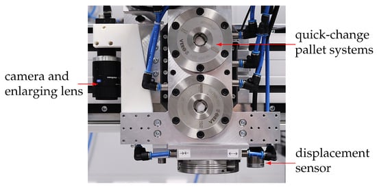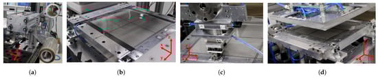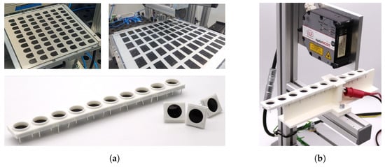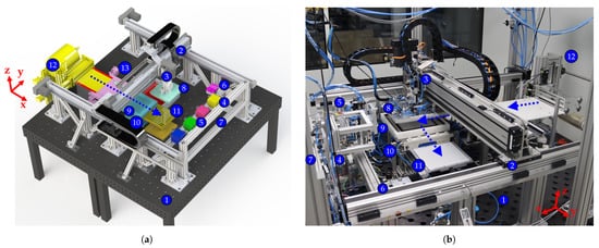 Design and realization of the laboratory scale process are depicted in Figure 10a,b. It was located in an air-conditioned area meeting ISO cleanroom class 7. The experimental arrangement was installed on a mounting plate (1) with a total surface area of . Positioning and motion control tasks were enabled by a spindle axis gantry system (2) with traverse speed up to 300 providing a static repeat accuracy of μm in each direction. The axes were driven by synchronous drives supporting real-time communication with a Siemens S7-1500 technology programmable logic controller (PLC). The z-axis contained three quick-change pallet systems (3) for flexible tool mounting, both frontal and from below, with a repeating accuracy μm. Tools, e.g., electrode application system (4), laser head (5) and rolling knife (6), were located in the module retainer (7) in the front part. They could be automatically attached to the z-axis. The gripper module (8), which mainly enabled the film handling, was attached to the gantry. The base below (9) provided a storage area for the gripper module and contributed to the liner separation. An ionization module (10) was provided to neutralize electric charge after liner separation. On the working surface (11) film lamination, electrode application and cutting took place, to achieve high positioning accuracy of the production steps.