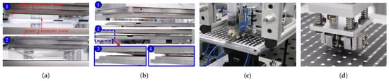 The gripper module, shown in Figure 12a, consisted of two independently adjustable pressure areas: a large inner porous aluminum surface and a closed, about 5 wide, edge region. The sucking edge fixed the elastomer film’s surrounding borders and simultaneously sealed the inner pressure zone against the environment. Applying an inner pressure separated the elastomer film from its liner. After reducing electrostatic charge with an ionizer, the film lamination, in accordance with Section 2.2, took place. The gripper was positioned above the heated working surface, see Figure 12b (1) and a contact distance was adjusted (2). During steps (2) to (4), the elastomer film was inflated and made contact with the DE laminate. To release the film, an overpressure was applied to the edges while the gripper moved up again. After replacing the gripper by the printing system, an electrode pattern was printed onto the substrate. Beforehand, corresponding electrode patterns had to be translated into machine code. The working surfaces were heated up to a temperature of about 85 , as preliminary investigations indicated that temperature induced evaporation of the applied solvent-based electrode ink and reduced swelling effects [60]. The current temperature was controlled by the PLC using a PT1000 sensor. Once the electrode application was finished, the described steps were repeated until a desired number of DE layers had been reached. In a final step, the circular blade could be used for cutting linear slits to obtain separated DE entities, as depicted in Figure 12d. For in situ process monitoring, the z-axis contained a Hikrobot MV-CS200-10GC 20 MP camera with changeable enlarger lens, as shown in Figure 13. Moreover, a confocal chromatic displacement sensor Keyence CL-P015G, with a distance resolution of 3 , was provided to measure electrode surfaces and thickness of the transparent DE layers.