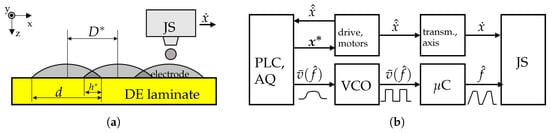 For manufacturing electrode layers, the before-mentioned jetting system (JS), Vermes MDS 3280, was chosen. However, to achieve homogeneous electrode layers, the drop frequency had to be precisely adapted to the variable axis speed . The drop based electrode application process is schematically depicted in Figure 14a. By adjusting the JS parameters, the drop diameter d could be defined. Moreover, an overlap could be specified to avoid gaps between the single drops on the substrate. Using these quantities, the set point drop distance was determined. As a function of the absolute print head speed , the corresponding trigger frequency was given by