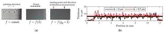 In Figure 15a printing results for different drop frequency controls are illustrated. When printing with constant drop frequency , the electrode could accumulate when axis speed reduced. In this case, the drop frequency was additionally halved to measure the drop diameter of and to illustrate the negative effect of missing frequency adjustment. Simply using significantly improved the electrode uniformity, whereas the pre-control with dead time compensation also provided a uniform electrode surface at the edge regions for high acceleration values. Using a confocal chromatic displacement sensor, two electrode elevation profiles perpendicular to the printing direction yielded average electrode thicknesses of 6 μm and 6.7 μm with standard deviations of 1.5 μm and 2.1 μm respectively. The deviations indicated a surface roughness resulting e.g., from the coffee stain effect.