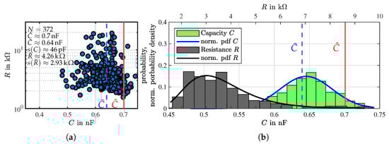 In Figure 17a capacity and ohmic resistance measurement results are illustrated as a scatter-plot. The mean value of the capacitance was about 8.6% lower than the calculated capacity value using Equation (12). Moreover, capacity values scattered significantly, quantized by standard deviation . It can also be stated that some capacity values were higher than the analytical mean value, which might be explained by manufacturing tolerances and, in particular, by larger electrode surfaces or parasitic influences on the capacity measurement. In contrast, resistance values were distributed over a range of more than one decade. Probably, the electric contact resistance had a significant impact. It might also be possible that a varying electrode thickness, with locally distributed low conductivity spots, could have influenced the results. Thus, a comparison to analytic results was considered unsuitable. In Figure 17b the histograms and the fitted, normalized probability density functions (pdf) suggest that mainly random errors influenced the manufactured DE transducers. This might indicate that the electrode surface area slightly varied or that remaining air inclusions were present, which could reduce the DE transducer’s capacitance.