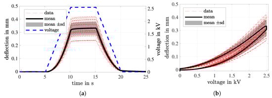In Figure 18a the measured displacement versus time for specimens is illustrated. The maximum deflection during the hold time varied from and a maximum standard deviation μm was evaluated. The deflection characteristic during rise and fall time was in accordance with a squared dependence of actuation voltage v. During hold time, a small creep of less than could be observed for most specimens. Among other reasons, this could be traced back to creep and relaxation processes inside the electrode material [61], insufficient layer bonding or a compliant mechanical membrane mounting. The relatively high standard deviation might indicate active layers with insufficient electrical bonding, performance reduction due to variation in electrode thickness [26] or also inaccuracies with respect to the mechanical frame mounting. Beforehand, preliminary investigations of the impact of uncertainties on the actuation of DE multilayer transducers showed that deviations in actuation stretch and force could be more pronounced regarding DE transducers with a small number of DE layers [62]. In Figure 18b the mean course of deflection versus applied voltage pointed out slight hysteresis behavior, which might have been caused by material creep [61].