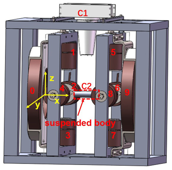 The electromagnetic coil distribution structure of the MSBS is shown in Figure 1. The electromagnetic coils of the MSBS are divided into five pairs, one in the x-direction, two distributed in the y-direction, and two pairs distributed in the z-direction. The head and tail of the suspension model are not only distributed with a pair of x-direction coils but also a pair of y-direction coils. The suspension model contains a permanent magnet. The repulsion of one coil adjusts the displacement in each direction to the suspension model and the suction of the other coil to the suspension model. Coils 0 and 9 are x-direction coils, which are used to control the x-direction movement of the suspension model. Coils 1, 3, 5, and 7 are z-direction coils used to control up, down, and pitch movements. Coils 2, 4, 6, and 8 are y-direction and are used to control the movement in the left, right, and yaw directions. At the same time, the rotating magnetic field is superimposed by coils 5, 6, 7, and 8 and is used to control the movement in the rolling direction. C1 is a visual sensor used to measure the position of the suspended model. C2 is the position of the suspended model.