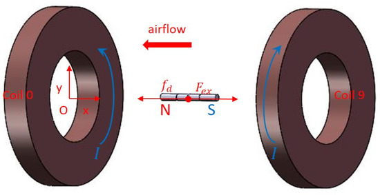 The schematic diagram of the x-direction coil and suspension model is shown in Figure 2. Then, the physical equation of the MSBS in the x-direction with the rod aligned with the coil axis is deduced. The magnetization curve, shape, and size of the permanent magnet model material are known, and the coil size, position relationship, and number of turns are known. These known quantities are used to calculate and analyze the x-direction electromagnetic field and the electromagnetic force on the magnetic rod that is the suspension model.