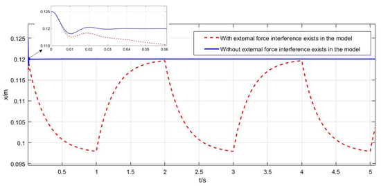 We apply a square wave interference with a period of 2 s and amplitude of 0.3 N to the system. When there is interference and no interference, the control effect of x-direction displacement is compared, as shown in Figure 4. The solid blue curve is the x-direction position of the suspended model under the action of no external interference. It can be seen that it quickly approaches the target position of 0.12 m from the initial position, which is 0.125 m, and then remains stable. However, the red dotted curve is the coordinate of the suspended material center under the action of interference. It can be seen that under the action of interference, the position of suspension control is constantly changing and fluctuating, the x-direction position is changing between 0.098 and 0.12 m, and the fluctuation value is 0.012 m.