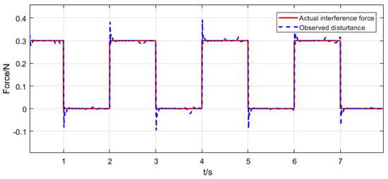 The comparison diagram between the observed external interference and the real applied interference is shown in Figure 5. The solid red line in Figure 5 represents the real external interference applied on the suspended object, which is a square wave interference with a period of 2 s and an amplitude of 0.3 N. The blue dotted line is the observed interference, and the estimated interference is consistent with the actual interference. However, there is an overshoot oscillation at the rising and falling edges of the change of interference, and there is a small amplitude oscillation in the middle.