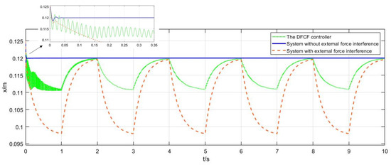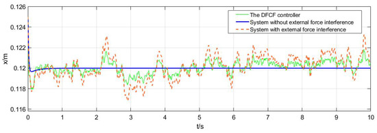 The wind force in the x-direction is sometimes a random disturbance. Figure 9 shows the control effect of the DFCF on random external disturbance. The blue curve is the position of the suspension model without external interference. It can be seen that it quickly approaches the target position from the initial position and then remains stable. However, the red curve is the position of the suspension model under the action of random external disturbance. It can be seen that under the action of the random interference, the position of the suspension model control constantly fluctuates, the x-direction position changes between 0.117 and 0.124 m, and the fluctuation value is 0.007 m. The green curve is the displacement control curve of the DFCF. It can be seen that although the displacement will fluctuate under the random external interference, the fluctuation amplitude is smaller than the red curve, only half of the red curve. The x-direction position changes between 0.118 and 0.122 m, and the fluctuation amplitude is 0.004 m. The amplitude of the random interference is 0.4 N.