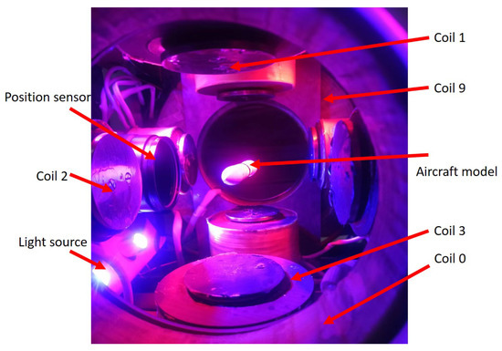 MIT, NASA, and Old Dominion University have further studied the MSBS and conducted aerodynamic tests on the spacecraft atmospheric reentry module with the MSBS [12]. There is an iron core ball inside the model. The inductive position sensor is used to detect the position of the suspension model. During suspension control, the inductive sensor is not affected by the ambient light intensity and has less signal noise. However, this method cannot detect the model’s rotation, so the rotation direction can not be controlled [13,14].