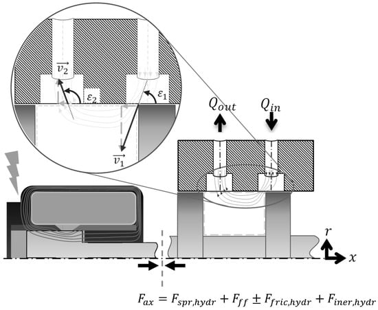 There are different approaches to determine the flow forces, including analytical calculation, determination by CFD simulation, as well as by measurement. For the analytical calculation of the flow forces, the approach formulated in Equation (2) proposed by Schmitz and Murrenhoff [17] can be used. It has been applied in several works [3,14,18,19] and has been extensively studied by Bordowski [3].