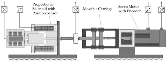 For the determination of the magnetic force, a metrologically obtained lookup table was used. It was generated by measuring the magnetic force at different currents and positions. Due to the simplified approach, the applied voltage was not used for modeling. The setup shown in Figure 6 and Figure 7 was used to measure the magnetic force. The test setup was designed to allow for precise measurement of a wide variety of valve solenoids. Figure 6 shows the mechanical part of the test rig.