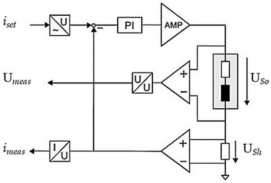 Figure 7 schematically shows the electrical part of the experimental setup. The circuit consists of the solenoid itself, an amplifier and a low-side measurement shunt (3 Ω ± 0.02%) for current measurement. The amplifier (Kikusuiu PBZ80-5) allows for, in push/pull configuration, the application of arbitrary currents and voltages. The solenoid is highlighted by a gray rectangle and is represented by an inductor and an ohmic resistor. The temperature change in the measurement shunt is small due to sufficient cooling. The resulting change in resistance is, therefore, negligible. The voltage is measured across the solenoid. The synchronized acquisition of voltage, current and force is carried out using a measuring amplifier (MC USB 404-60).