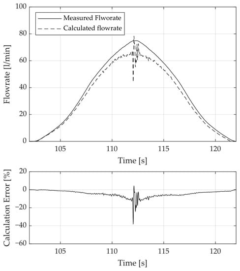 Examining Figure 9, it can be seen that a qualitative estimation of the flow rate is possible even with the use of a condensed model. The error between measured and estimated flow rate grows with increasing flow rates to up to 9 L/min or 11% FS and is maximum at the reversal point of the signal, with up to 30 L/min or 38% FS. The maximum flow rate of the valve is 80 L/min and defines the full-scale value. Other measurements also showed an increased estimation error with growing valve openings and flow rate.