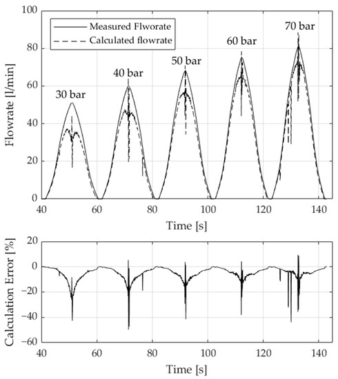 As already shown in Figure 5, various combinations of spool positions and flow rates are possible during operation. For this reason, the validation was also carried out for other pressure differences, as depicted in Figure 10. Like before, over the control edge PB of the valve, five various differential pressures of 30, 40, 50, 60 and 70 bar were applied. At each pressure level, the spool was opened and closed at a rate of 5%/s. This leads to the measured triangular increasing and decreasing flow rate signal represented by a solid line. The estimated flow rate is indicated by a dashed line. The error between the estimated and measured flow rate is given as before. Figure 10 shows that for the other pressure levels considered, the error also grows with increasing valve opening or flow rate. In all measurements, the error is greatest when the spool is at rest, while the direction of movement is changed. This observation can be explained by the occurrence of frictional forces described above. Both at the second pressure level of 40 bar and at the last level of 70 bar, sharp increases in the measurement error can be observed. After further examination, these could be traced back to acquisition errors of the position signal. In order to make the soft sensor more robust against such errors, future models will aim at filtering the position signal.
