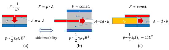 - The relevant normalization area is given using the gap area in the direction of movement: , and for standard “dry” actuators with gas-filled gap d, the dielectric constant is almost 1. As the area to which the pressure applies does not change with actuation, the resulting force is constant as long as both plates do not fully overlap. Additionally, a tangential actuation of dielectrics, particularly liquids, can be approximated in a similar way. In this case, any dielectric (dielectric constant is drawn into an air-filled capacitor (see Figure 1c). Here, the calculation of the electrostatic pressure results in a quite similar formula: ; note that this electrostatic pressure is usually much larger due to the factor and will be used for the springless long-stroke actuation.