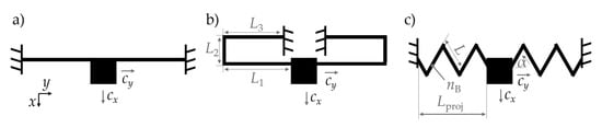Further common spring geometries for in-plane deflection include the M-shaped springs with non-linear, asymmetric force–displacement characteristics []. An advanced geometry is provided for both triangular and sinusoidal springs []. The triangular springs (Figure 2c) have an almost linear force–displacement characteristic with a high selectivity, achieving large deflections in both positive and negative x-directions. These springs are highly variable in appearance, as the number of spring segments (nB), the length L of each beam, and the inclination angle α can be varied. The triangular springs can be transferred to sinusoidal springs. The sinusoidal shape reduces the local stress appearing at the kink from one beam to the next and thus reduces the risk of rupture [].