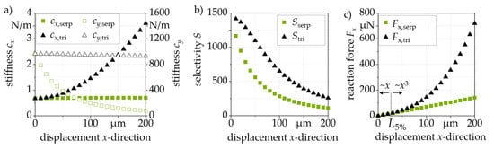 Figure 3 compares the cx- and cy- stiffness of a triangular and a serpentine spring. Both springs exhibit the same stiffness and selectivity in idle mode. With increasing stroke, the stiffness cx quadratically increases for the triangular spring, while it remains constant for the serpentine spring. The stiffness cy shows a sharp drop for the serpentine spring, while it remains almost constant for the triangular spring. The selectivity S resulting from (4) decreases much faster for the serpentine spring than for the triangular spring.