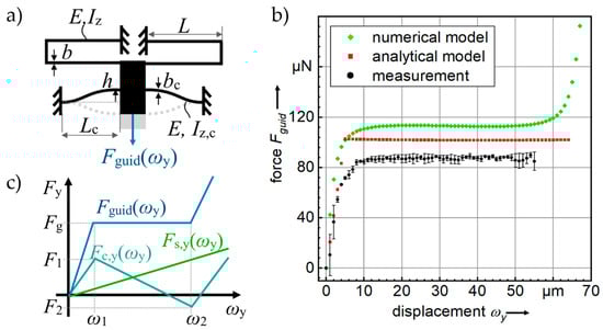 Constant-force mechanisms: (a) Setup, (b) the constant force characteristics resulting from a mechanical anti-spring with the negative spring rate Fc,y, and (c) a spring with the linear spring rate Fs,y combined with a spring with bi-stable spring rate Fc,y resulting in a constant force Fguid, as presented in [].