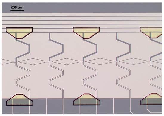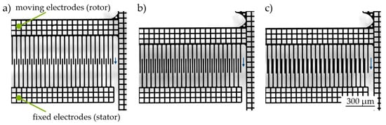 Despite this, the pull-in condition allows for a very efficient low-voltage high-force actuator by means of the cascaded stiffness of the springs, as demonstrated in []; it can thus achieve a stable “digital” behavior (undeflected/fully deflected at U = 0/U = Upull-in). For this purpose, the electrodes are electrically insulated (e.g., using SiO2) to prevent a short when the electrodes contact. Here, the bending-plate actuators are combined with triangular/serpentine springs (see Section 2.2) as shown in Figure 8. As known from [], the stator features electrodes which connect to a rigid cantilever, and the rotor features thin electrodes which connect to the actuated platform, guided by flexible springs. The cascaded stiffness is part of the specific design, as the thinnest cantilevers bend at the start of the process, then becoming more and more attracted, and finally end up fixed to the stiffer cantilevers.