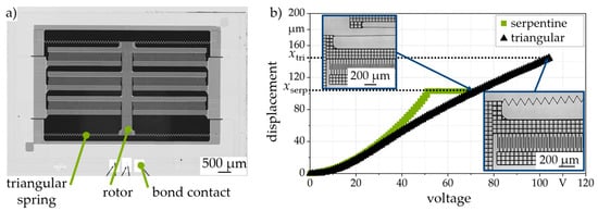 According to (11), the deflection increases in line with increasing spring selectivity S []. Therefore, the springs presented in Figure 3 are suitable to fulfil this requirement. Figure 6a shows a microscopic image of a fabricated actuator with triangular springs. Figure 6b shows the voltage-dependent displacement of two comb-drives: The deflection of the actuator with serpentine springs was approximately quadratic to the applied voltage (x ~ U2), the maximum deflection was limited to 103 µm and 70 V whereas the actuator with triangular springs achieved a maximum deflection of 145 µm at 104 V, an increase of more than 40%. Furthermore, the voltage-displacement characteristic remained almost linear.