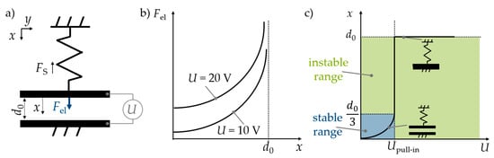 (a) Setup of an electrostatic parallel-plate actuator, (b) exemplary force–displacement characteristic curve, (c) exemplary electrode displacement depending on the applied voltage.