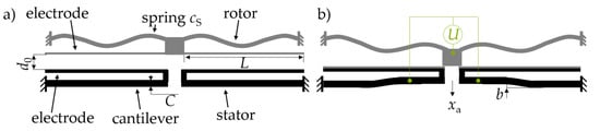 The switching speed is limited by squeeze film damping, as the air within the gap between the electrodes has to be squeezed out; a process that is accelerated by higher forces at higher voltages []. During pull-in, the stiff cantilever also slightly bends the distance b towards the electrodes, which reduces the displacement of the bending-plate actuator xa (Figure 8b). Therefore, it is not only the spring stiffness cs, but also the cascaded cantilever thicknesses that strongly influences the pull-in voltage []. For the actuator shown in Figure 8, the pull-in voltage is described as follows []: