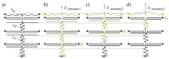 To achieve long-stroke actuation, systems based on cascaded actuators are our objective. An effective way to achieve such systems is to stack bending-plate actuators with stepwise increasing gaps and connecting springs ci [,,]. From the initial position (Figure 9a), the actuation starts by applying a voltage to the first actuator a1, after which the system moves for xactuator,1 and the gap at actuator a2 decreases. By additionally applying a voltage to the second actuator a2, the system displaces again, now for the distance xactuator,2. When all three actuators a1, a2 and a3 are activated, the system reaches xactuator,3. The required voltage does not increase; a1–a3 operate at the same pull-in voltage.