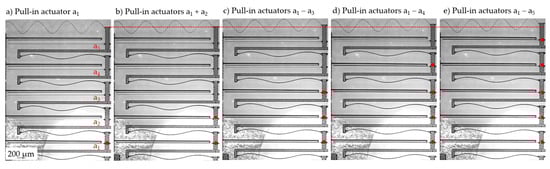 For this study, an actuator in line with Figure 9 was realized and evaluated. The actuators were sequentially activated. Figure 10 shows the resulting displacement due to the step-by-step activation of the actuators. The red dots mark the actuators with an applied voltage. In [], we present the evaluated experimental displacements as well as the dynamic switching behavior, showing eigenfrequencies between 90 Hz (avg. cg = 2.90 N/m) and 139 Hz (avg. cg = 0.17 N/m), depending on the stiffness of the guiding spring. A video of the stepwise displacing actuator is available at https://etit.ruhr-uni-bochum.de/mst/forschung/projekte/marie/ accessed on 28 March 2023.