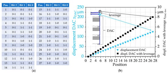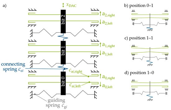 With N = 3 connected bits, the resolution of the DAC subsequently increased from 23 = 8 to 33 ≙ 27, as presented in Figure 12a. Bit 0 proved to be the least significant bit (LSB). The displacement of the LSB resulted in a partial deformation of the connecting springs  and . As the output of the most significant bit (MSB) is not connected to a further spring, the entire MSB displacement resulted in the DAC displacement. Therefore, the impact of each bit on the final system displacement appears to add up along the chain of the connecting springs. The DAC resolution can be enlarged by adding more sliders, such that a combination of, e.g., four or five sliders would result in a resolution of 34 ≙ 81 or 35 ≙ 243, respectively. By adding more bits to the DAC, the overall DAC displacement xDAC increased, too. As the DAC is a mechanically connected system, the stiffness of the springs and actuators is important for the linearity of the actuation and a large stroke, which has also been investigated by Sarajlic et al. []. The DAC stiffness is important for large displacements when connecting the DAC to a mechanical leverage, which results in an increased DAC displacement (experimentally, up to 234.5 µm, as shown in []).