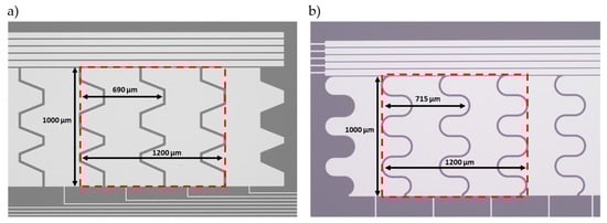 Two different shapes of electrode arrays consisting of interdigital electrodes have been investigated so far; one had trapezoidal boarders, and the other one had sine shaped boarders, as shown in Figure 13. The interdigital structures ensured an increased contact line between the droplet and the neighboring electrode. The gap between the two electrodes was set to be about 20 µm. This system was designed for a drop with a contact area radius of 600 µm, corresponding to a drop of, e.g., DI water with a volume of 1.2 µL, and a contact angle of 120° in air. This demonstrator used DI water, but other polar fluids are also suitable, e.g., low-vapor pressure polar fluids such as ethylene glycol ( = 37) and glycerol carbonate ( = 110).