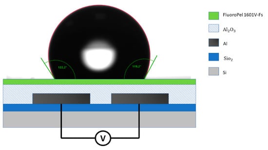 The electrodes were realized using lithographically structured aluminum on silicon, with a 2 µm thermal SiO2 layer to insulate the electrodes. The dielectric layer consisted of 110 nm Al2O3, deposited using atomic layer deposition (ALD). To achieve a reliable hydrophobic surface with a contact angle >90°, a 1% fluoropolymer solution (FluoroPel PFC1601V-FS) was applied by means of spin coating (Figure 14).