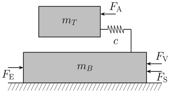 For an approximated model describing the dynamic behavior of the long-stroke actuator for precise motion control, the system is decomposed into the four droplet bearings suspending the actuator platform. The elastic behavior of the droplets is represented by the spring constant c. A single droplet can be described using the mechanical analogy depicted in Figure 15.