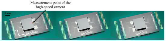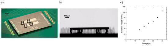 A stable movement with the payload of the platform could be achieved at 40 V. A video of the moving platform is available at https://etit.ruhr-uni-bochum.de/mst/forschung/projekte/kommma-raeumliche-aktorik/, accessed on 28 March 2023. The speed of the moving platform depended strongly on the switching period of the electrodes. For a switching time of 85 ms at 42 V, the speed v of the platform was approximately 5.5 mm/s. The demonstrator platform allowed a maximum distance of 1500 µm (Figure 18). Theoretically, the stroke of this actuator system is infinite and determined only by the number of control electrodes.