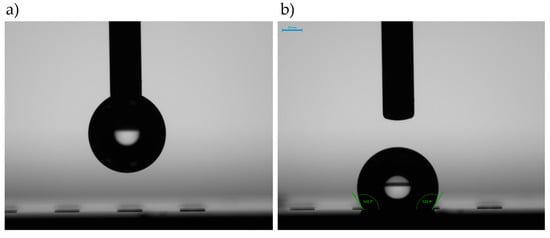 (a) Droplet above the photoresist barriers; (b) droplet after placement on the hydrophobic structures.