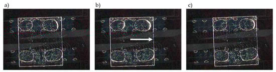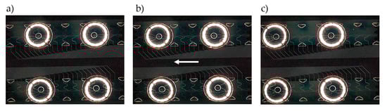 Figure 22 shows four droplets without load that are moved synchronously by means of applying 25 V to the control electrodes. The increased voltage (compared to 20 V in []) is needed to overcome the additional barriers. Figure 23 shows the setup with barriers, four liquid bearings and the platform on top. In this case, the platform consisted of a 100 µm thick glass substrate, likewise coated with FluoroPel, and the droplets stuck locally to the platform. Again, two electrodes had to be activated simultaneously to move the platform. A voltage of 35 V was applied to the activated electrodes for 500 ms. The platform was able to move step-by-step. The forward movement is shown in Figure 23. The use of mechanical barriers to create multi-stable states for the drop-based long-stroke actuator was thus successfully demonstrated. These energy states can easily be adjusted using the height and shape of the barriers.