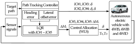 In view of the actuator combination for path tracking, front wheel steering (FWS), rear wheel steering (RWS), 4-wheel steering (4WS), 4-wheel independent steering (4WIS), 4-wheel independent braking (4WIB), and 4-wheel independent driving (4WID) have been selected to date [30]. Among these, rear wheel independent steering (RWIS) has not been used as an actuator for path tracking. In this paper, 4WS stands for the combination of FWS and RWS. To date, most path tracking controllers used for autonomous driving have been designed for a vehicle with front-wheel steering (FWS), which resulted in conventional Ackerman steering being adopted for PTC [7,8]. On the other hand, the other actuators, except for FWS, have been widely adopted as actuators in the area of vehicle stability control (VSC) [30,31,32]. In this paper, the term VSC means the yaw rate tracking and lateral stability control. For the last decade, thanks to the development of in-wheel motor (IWM) systems, independent steering, braking, and driving systems such as 4WIS, 4WIB, and 4WID have become available for VSC [33,34,35]. These actuators have also been used for PTC [12,13,14,15,16,17,18,19,20,21,22,23,24,25,26,27,28,36]. Generally, FWS, RWS, and 4WS can be easily included in the input configuration of LQR as a control input. On the contrary, 4WIS, 4WIB, and 4WID cannot be included in the input configuration of LQR because the input matrix of the state-space equation cannot be derived with these actuators. To utilize these actuators for path tracking, ΔFx or ΔMz should be included in the input configuration. After calculating these control inputs, these should be converted into longitudinal and later tire force by a control allocation method. This paper checks the effects of these actuators on path tracking performance.