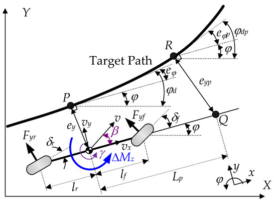For PTC, LQR was designed with the state-space equation derived from the lateral offset and heading errors. To obtain the state-space equation for PTC, a 2-DOF bicycle model was adopted. Figure 2 shows the coordinates and variables of the model and the target path used for path tracking [38]. For this model, it was assumed that the longitudinal velocity, vx, is constant. The equations of motions of the model are derived as Equation (1) with the state variables [34]. The slip angles of front and rear wheels, αf and αr, are defined as Equation (2). In Equation (1), the lateral tire forces of front and rear wheels, Fyf and Fyr, are assumed to be linear to αf and αr, as shown in Equation (3), respectively. In Equation (1), ΔMz is the control yaw moment needed for VSC and PTC. By combining Equations (1)–(3), the linear equations for the 2-DOF bicycle model were obtained as Equation (4).