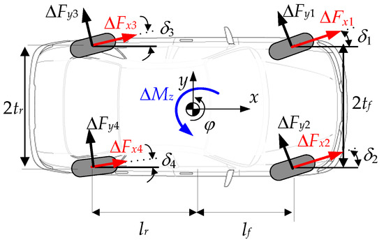 Figure 3 shows the coordinates of the tire forces and ΔMz, when ΔMz is positive [34]. The wheels in Figure 3 are numbered as 1, 2, 3, and 4 following the order of front left, front right, rear left, and rear right wheels. In Figure 3, ΔFx1 to ΔFx4 are the longitudinal tire forces generated by 4WIB and 4WID. If a longitudinal tire force is positive, then it is generated by 4WID. Otherwise, it is generated by 4WIB. Additionally, ΔFy1 to ΔFy4 stand for the lateral tire forces generated by FWS/RWS, 4WS, and 4WIS. Among them, ΔFy1 and ΔFy2 are generated by FWS, and ΔFy3 and ΔFy4 are generated by RWS or 4WS. To determine eight tire forces, the WLS-based method was used.