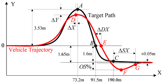 The measures ΔX and ΔY stand for the agility and the reachability, respectively. If ΔX is negative, it means that the vehicle reached its peak, point D, early before target point A, as shown in Figure 4. In fact, ΔX can be regarded as a rising time to reach the peak. If ΔY is negative, it means that the first peak of the vehicle trajectory, Y(D), did not reach the target position, Y(A). In this paper, if ΔY is larger than −0.05 m, then the path tracking and collision avoidance performance of a controller are regarded as satisfactory.