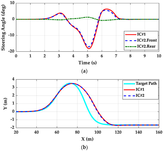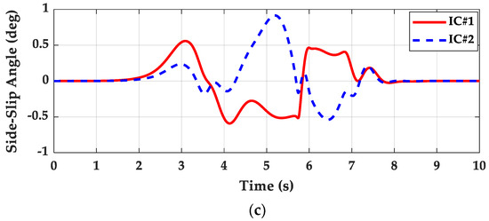 Figure 5 and Figure 6 show the simulation results for IC#1 and IC#2. Table 5 summarizes those results. As shown in Figure 5 and Figure 6, the LQRs with IC#1 and IC#2 gave nearly identical results and showed satisfactory path tracing performance on low μ roads. The side-slip angles of these controllers were kept as small and nearly identical to one another in spite of the low μ condition. This means that lateral stability was maintained well by the path tracking controllers. In the case of IC#3, this was caused by the small rear steering angles, as given in Figure 5a. As shown in Figure 5c, the side-slip angles of IC#1 and IC#2 were less than 1°, which means that lateral stability was maintained well.