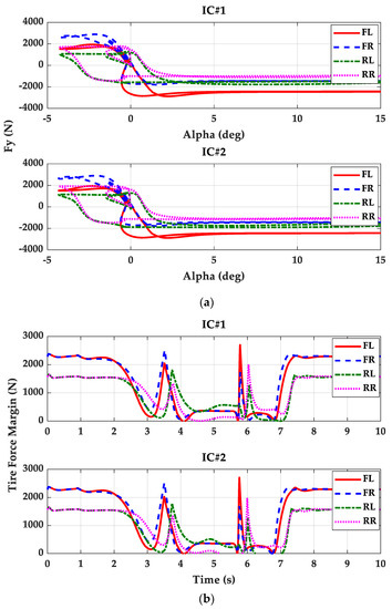 Simulation results of tire forces for IC#1 and IC#2: (a) slip angles vs. lateral tire forces, (b) tire force margin.