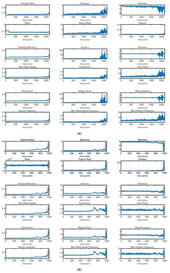 In order to find the degradation law for the bearings and to improve the RUL prediction accuracy, a variety of features were extracted on the basis of the original bearing vibration signal. Fourteen features including the maximum, standard deviation, and root mean square (RMS) values were extracted from the time domain range. Simultaneously, four features, namely center of gravity frequency, average frequency, RMS frequency, and frequency standard deviation, were extracted from the frequency domain range. As shown in Figure 8, using the adaptive feature selection method, these 18-dimensional features were extracted for three types of bearings: Br1-3, Br2-1, and Br3-3.