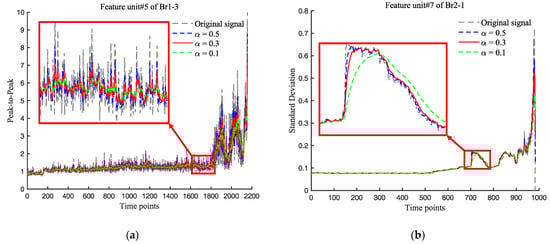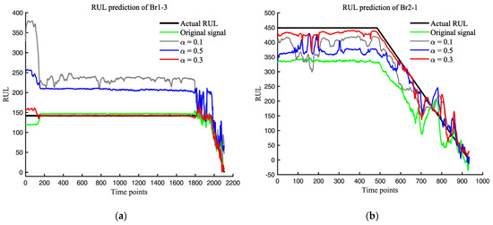 The value of α in the exponential smoothing method determines the degree of smoothing. The larger the α, the greater the influence of the recent data on the prediction results; the smaller the α, the smoother the data. When the data remain unchanged in the long term, α can be taken within 0.1 to 0.5 [19]. We selected α-values of 0.1, 0.3, and 0.5 to treat the 18-dimensional features of the three bearings separately. A random feature of each bearing was selected to demonstrate the exponential smoothing (Figure 9). For all three bearings, the effect of the different α-values on the RUL prediction results are compared and displayed in Figure 10.