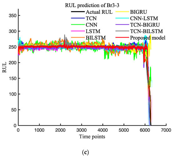 (a) RUL prediction of different feature models on Br1-3; (b) RUL prediction of different feature models on Br2-1; (c) RUL prediction of different feature models on Br3-3.