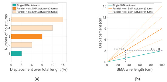 The percentage of displacement achieved varies with the number of nylon turns in the hoist system. Figure 2a shows a comparison of different hoist configurations and highlights the single-SMA actuator and the selected number of thread turns in this study. The actuation range linearly increases with the same SMA wire length, thus substantially reducing the the size of the actuator, as shown in Figure 2b.